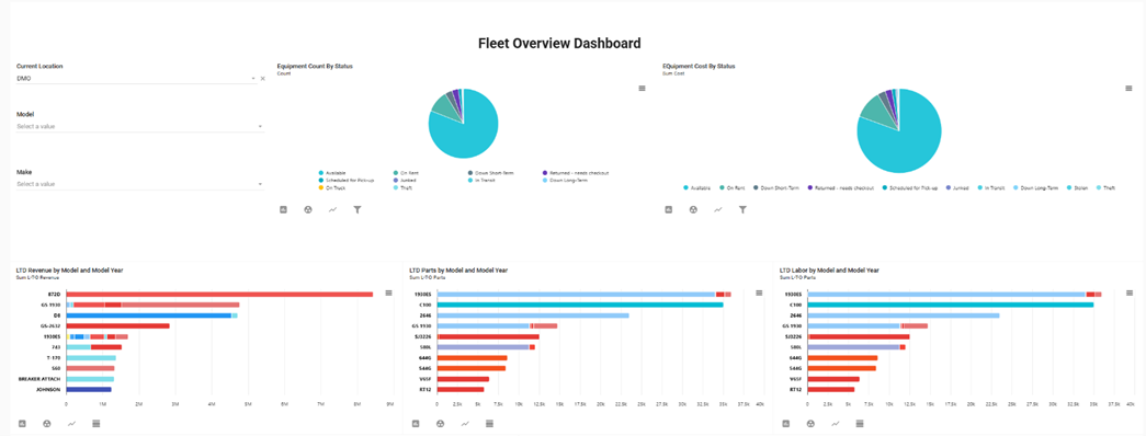 The Equipment Master report provides a complete view of a company’s fleet inventory. Flexible sorting and filtering by category, class, make, model, status, and more makes it easier to understand utilization and availability at a glance. Spot over-performing assets, under-performing assets, gaps in your available fleet, and opportunities to expand into new types of equipment.